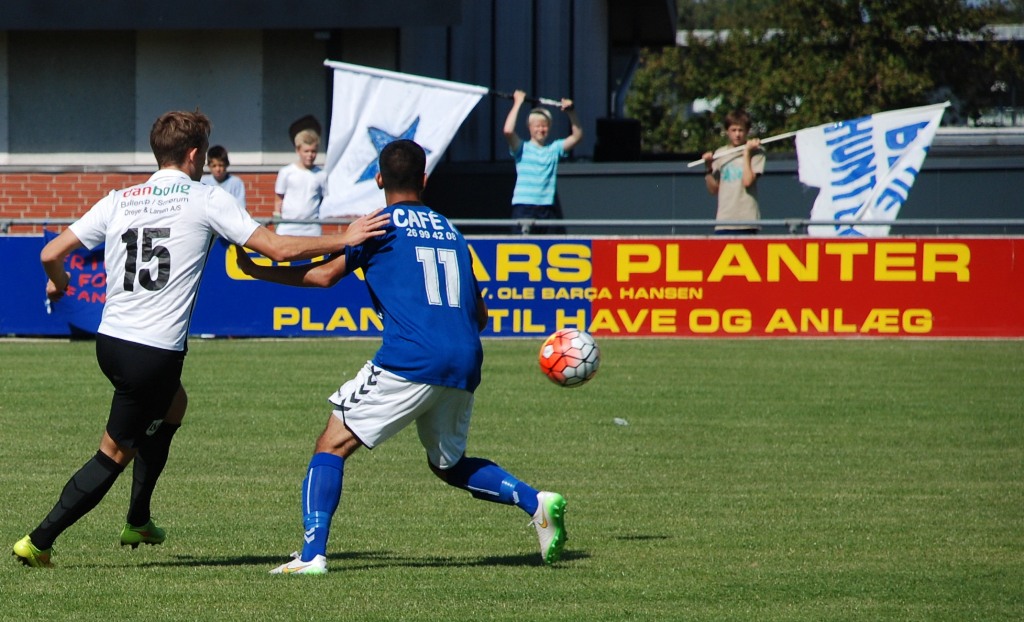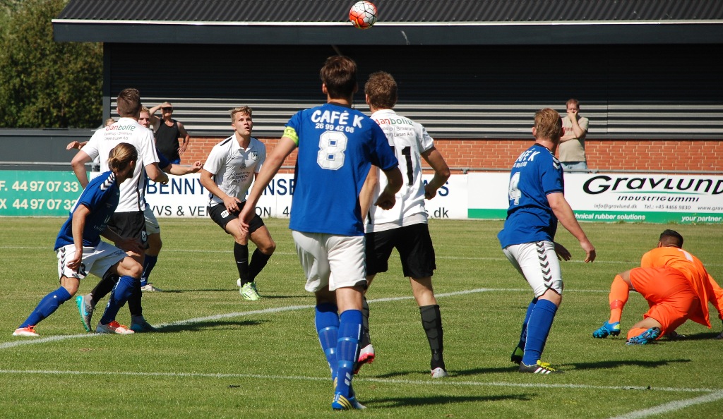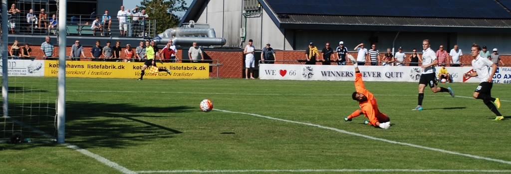 Denne gang var det kampens spiller Emil ”EK” Kjærsgaard der skulle tage frisparket og han krøllede bolden ind uden chance for Butt i målet.